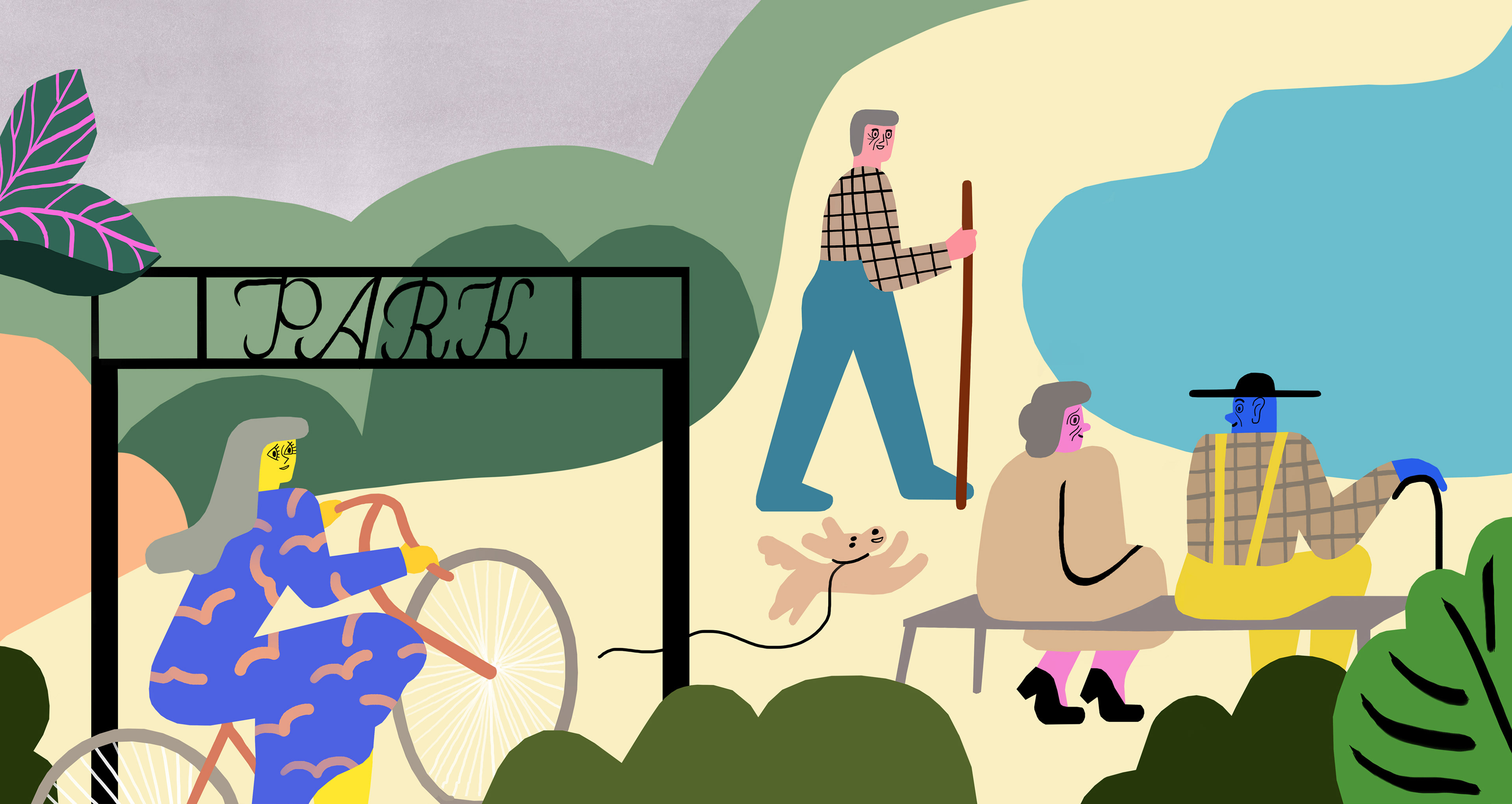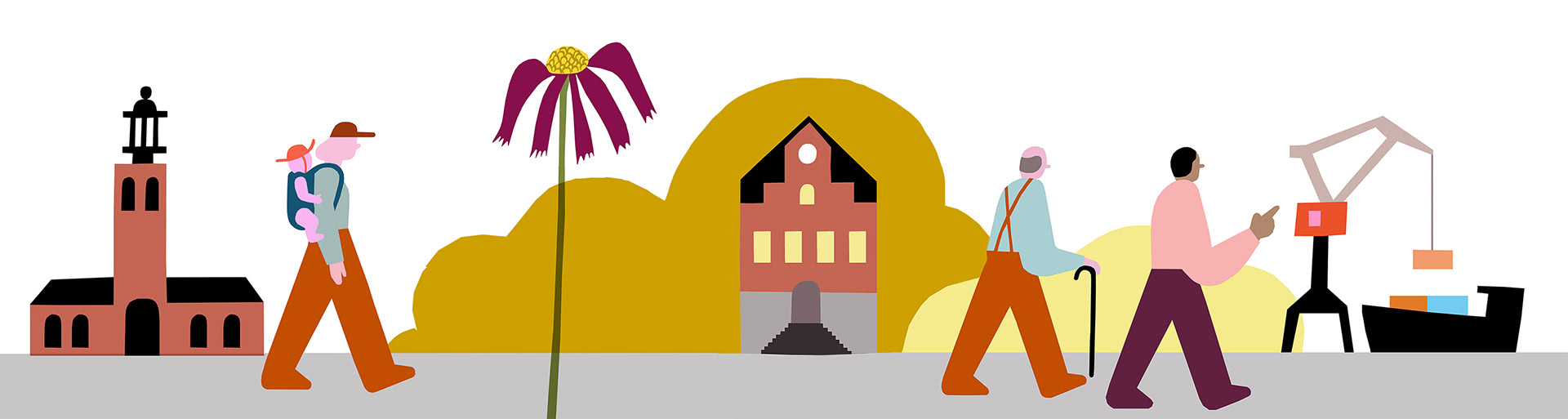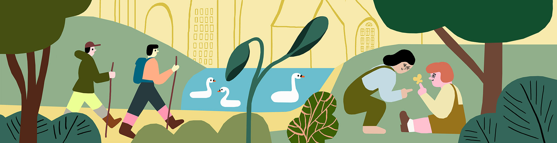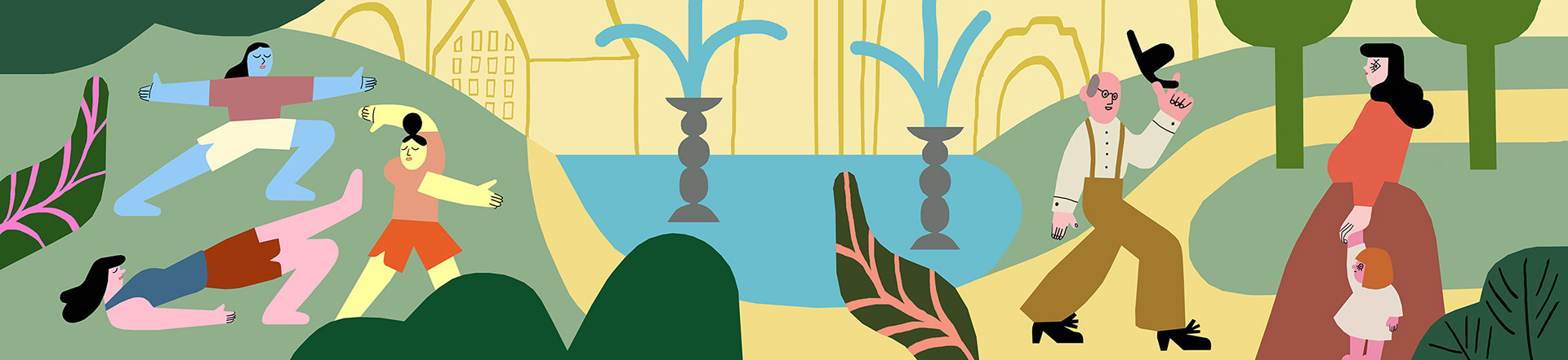 Illustrationer till artiklar om gröna städer, hälsa och välbefinnande.